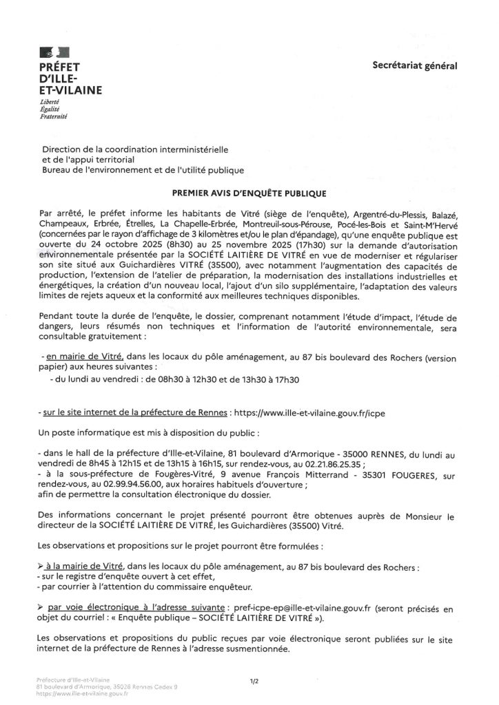 Préfecture 35 – Premier avis d’enquête publique – Société Laitière de Vitré