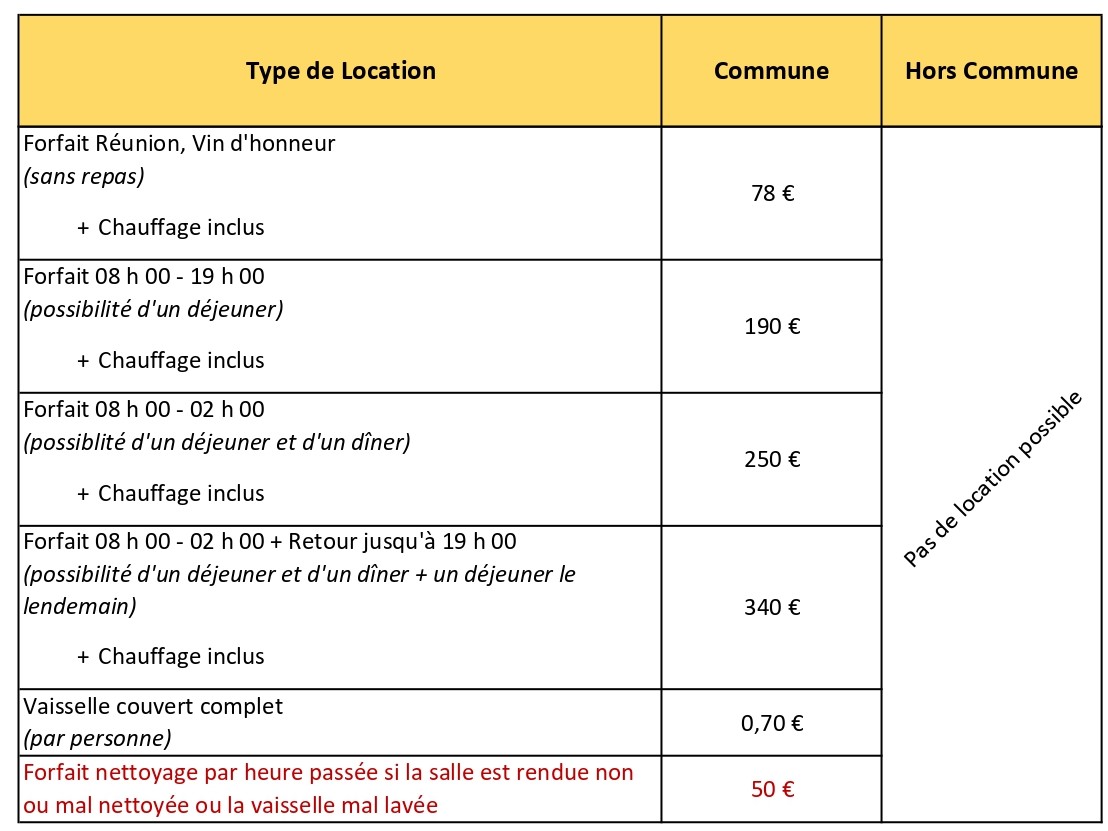La salle est adaptée pour les petits évènements familiaux puisqu’elle peut accueillir 80 personnes assises pour un repas. Elle est équipée d’un hall d’entrée, de deux salles (une grande et une petite), d’une cuisine et de sanitaires. Il n’est pas possible de la louer en semaine puisqu’elle sert à l’école en période scolaire et à l’accueil de loisirs sans hébergement les mercredis et pendant les vacances.